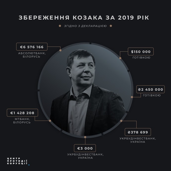 В 2018 году в декларации соратника Медведчука появляется счет в Минском Транзитном Банке (JSC "MTBank") со сбережениями на сумму 2 160 297 млн евро. А в 2019 году Козак доверил сбережение еще 6,5 млн евро белорусскому Абсолютбанку. В том же Абсолютбанке имеют сбережения на немалые суммы Виктор Медведчук (850 тыс евро) и Оксана Марченко (4 млн евро).
