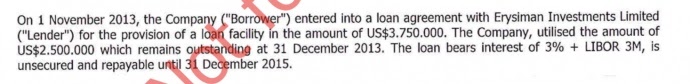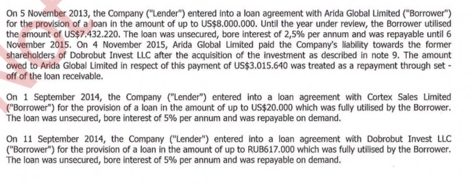 Вот например, 1 ноября 2013 года компания Turul Investments Limited заняла 3,75 млн долларов у компании Erysiman Investments Limited, из которых сразу освоено было 2,5 млн долларов. Затем через 3 месяца Turul занимает у той же Erysiman и сразу осваивает еще 1 млн 250 тыс долларов.