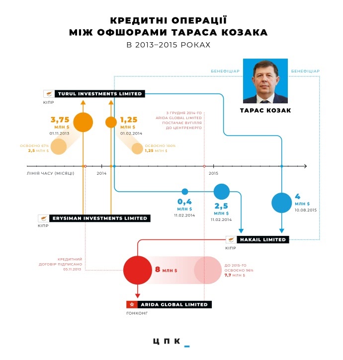 Подытожим: в 2013-2015 годах кипрская компания Тараса Козака, которая сейчас приносит ему основной доход в виде дивидендов на сотни миллионов гривен, была убыточной и играла роль перевалочной базы для миллионов долларов между сомнительными оффшорными фирмами, одна из которых поставляла на государственные компании контрабандный уголь с оккупированных территорий.