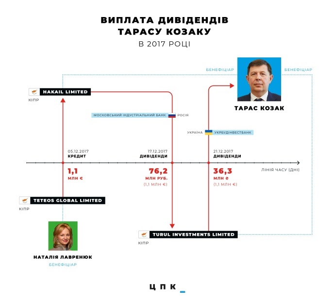 Это означает, что первые большие дивиденды на сумму 76,2 млн рублей, что составляло 1,1 млн евро, 17 декабря 2017 огода тправились к Козаку со счетов кипрской Hakail Limited в Московском индустриальном банке. Получение дивидендов он декларирует 21 декабря 2017 года в гривне - на сумму 36 301 320, что собственно и составляет 1,1 млн евро в эквиваленте.