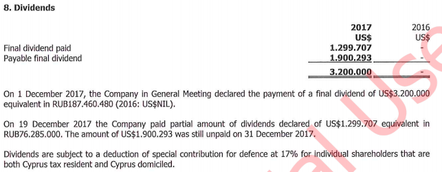 19 декабря 2017 года происходит выплата лишь части дивидендов, а именно 76,2 млн российских рублей. Остальные 1,9 млн долларов должны были бы заплатить в последующие годы, но мы не можем подтвердить выплаты из аудиторских отчетов, так как с 2018 года они уже не публикуются в кипрском реестре.