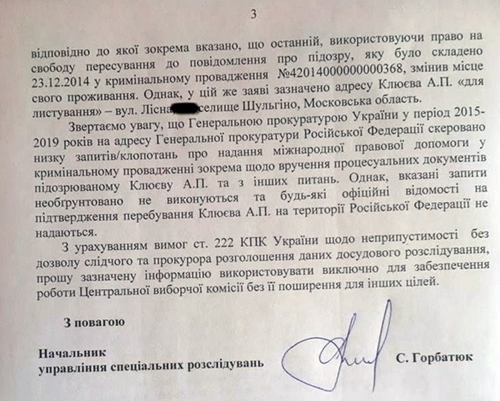 Але якщо підозрюваного оголосили в розшук, як-от Клюєва, розслідування може бути зупинене постановою слідчого. (Відповідно зупиняють і строки розслідування). Що і було зроблено 26.11.2018. Відновлюють його, наприклад, тоді, коли місце перебування підозрюваного встановлено і можна продовжити слідчі дії. Або якщо суд надасть дозвіл на розслідування в заочному порядку.