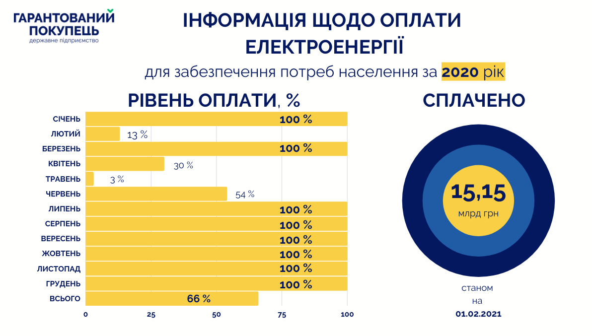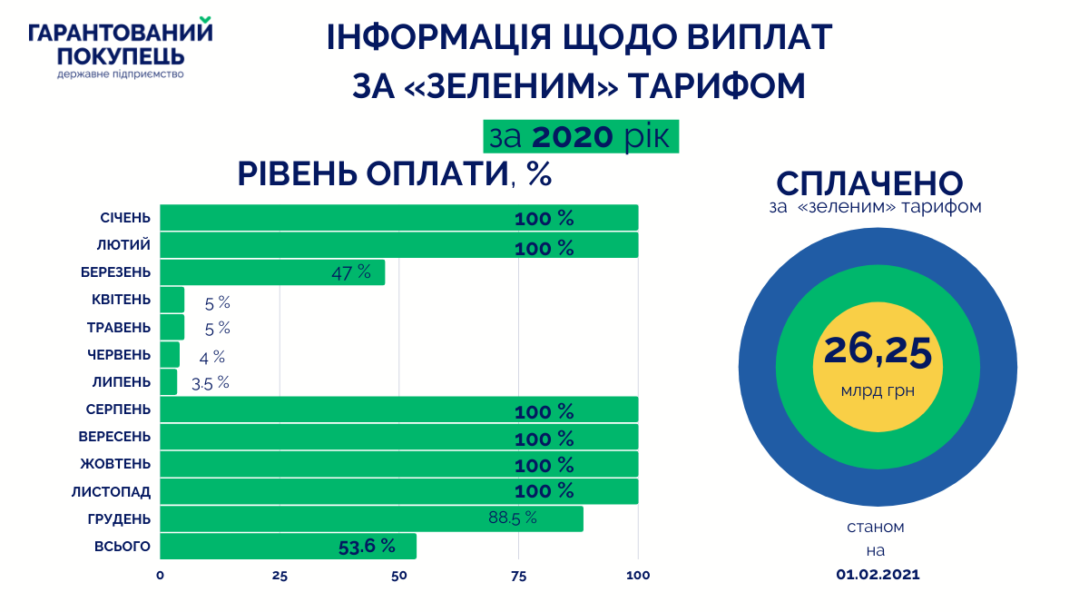 За даними "ГарПок", на початок 2021 року борг "Укренерго" перед ним для розрахунків за "зеленим" тарифом становив 23,9 млрд грн (та ще 6,9 млрд грн - для розрахунків з "Енергоатомом").