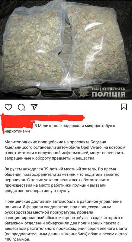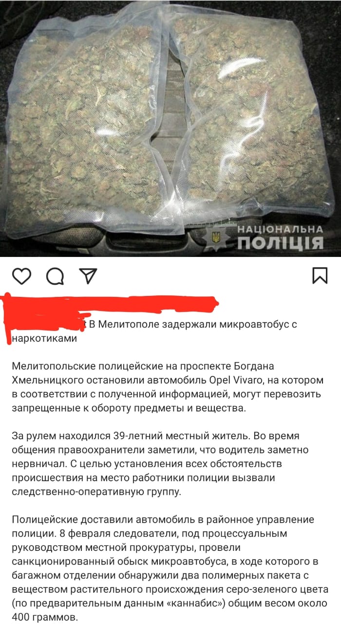 При цього біля затриманого автомобіля залишились співробітники поліції та начальник сектору СРПП №1 Мелітопольського РУП ГУНП в Запорізькій області Любишко Сергій Вікторович, який привласнив собі 2 полімерних пакета з наркотичним засобом «Марихуана» приблизною вагою 0.5 кілограма.