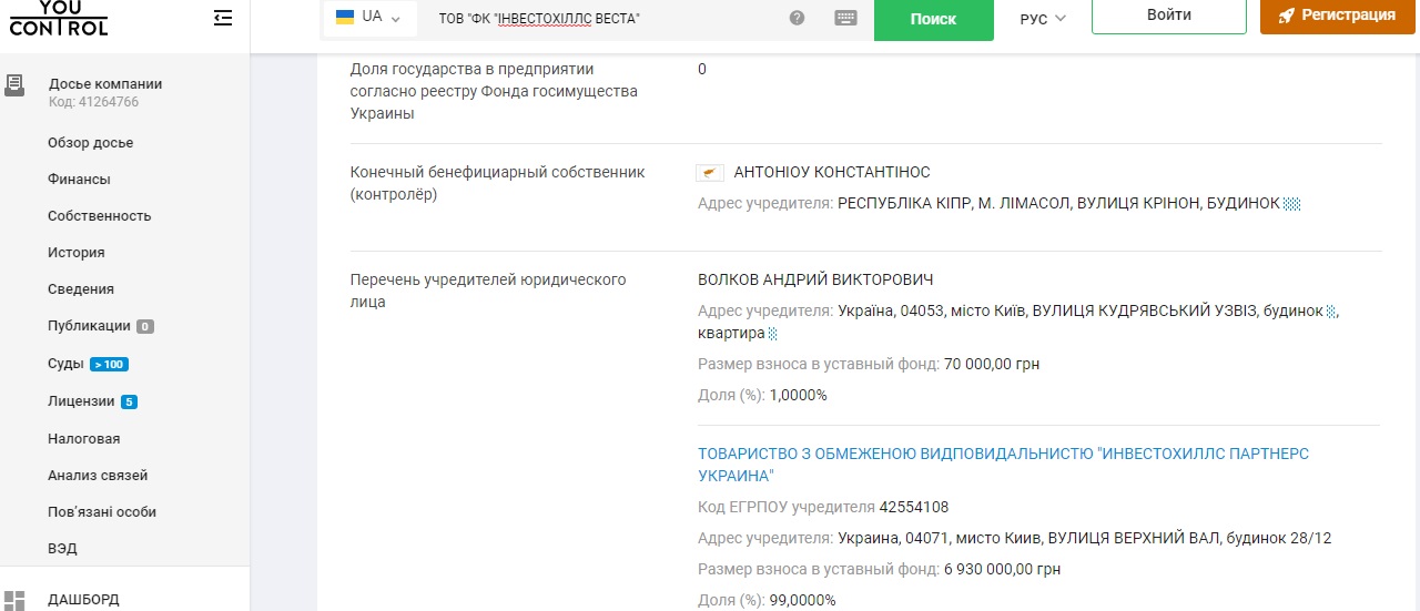 По данным сайта Youcontrol, учредителями финансовой компании «Инвестохиллс Веста» являются Андрей Волков, который владеет 1% акций и ООО «Инвестохиллс Партнерз Украина», которая полностью принадлежит кипрской «Инвестохиллс Партнерз ЛТД», а конечным бенефициаром их является Антониоу Константинос. Последний является простой прокладкой для настоящих владельцев, и известен тем, что обслуживает российских заказчиков.