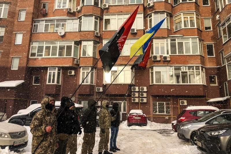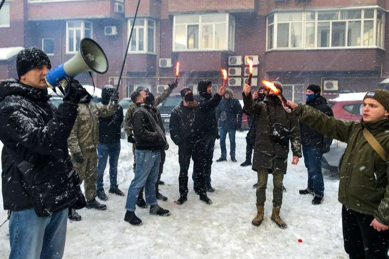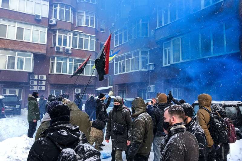 Несколько десятков человек пришли к дому на Подоле, в котором, по их словам, живет владелец пророссийского телеканала НАШ Евгений Мураев.