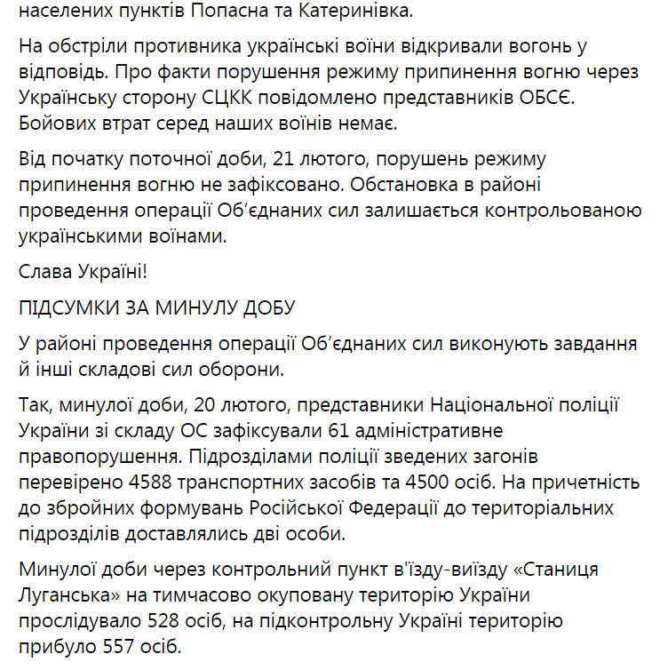 Что касается начала новых суток, 21 февраля, то в это время на линии всего фронта не было зафиксировано нарушения режима тишины. Ситуация в зоне ООС сохранилась под контролем украинских воинов.