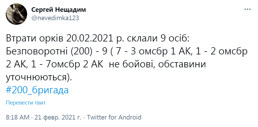 По данным на странице офицера ВСУ Сергея Нещадима в Twitter, 20 февраля потери российских террористов составили 9 человек, все они небоевые. В частности, речь идет о семи убитых из 3 ОМСБр 1 АК, одного из 2 ОМСБр 2 АК и одного из 7 ОМСБр 2 АК.