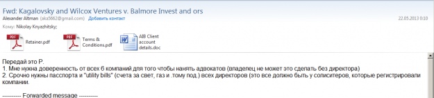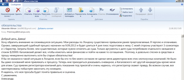 "Хочу обратить внимание на сложившуюся ситуацию. Мои расходы по Лондону существенно превысили ранее предполагаемые. Я терплю и оплачиваю. Однако, завершающий судебный процесс назначен на 9.09.2013 и будет длиться 4 дня плюс подготовка к нему. С моей стороны участвуют 3 солиситера и 1 баристер. Затраты более, чем существенные, которые нужно оплатить до суда. Только аргументы о дате суда потребовали отдельного заседания и стоили $20000. Кагаловский делает все, чтобы измотать меня финансово и пойти на какие то соглашения. Поэтому я довольно стеснен в средствах и прошу немедленно выполнить хотя бы старые обязательства!", - пишет Альтман.