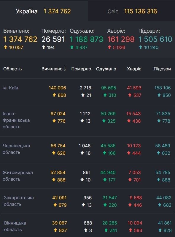 Кроме этого, в Киеве зафиксировано наибольшее количество летальных случаев от COVID-19 за сутки – 23 (всего умерли 2718 человек). На Буковине от последствий болезни скончались 16 жителей (всего 1046), Ивано-Франковщине – 13 (1212), Закарпатье – 13 (956), Житомирщине – 10 (861) и Винниччине – 3 (688).