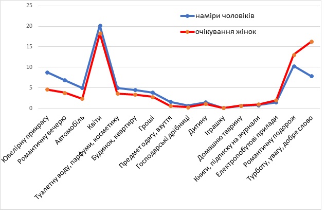 КМИС также поинтересовался планами мужчин по подаркам и сравнил их с ожиданиями женщин. Наибольшее расхождение между желаниями женщин и планами мужчин образовалось в двух пунктах: