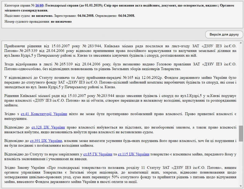 Вскоре после этого (в том же году) в Хозяйственный суд Киева был подан иск об отмене решения Киевсовета №283/944. Истцом выступило упомянутое выше ЗАО “ОЗСО Института электросварки им. Е.А. Патона” – владелец недвижимого имущества на земельном участке, который столичный горсовет передал в аренду ООО “Юрбудконсалтинг”. Ответчиком был определен Киевсовет (дело №16/60).