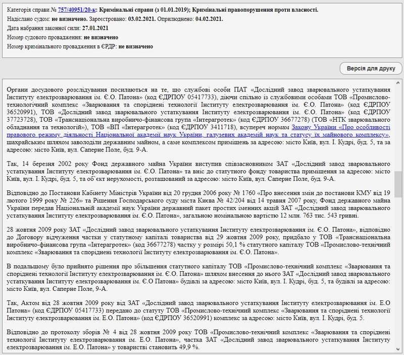 Уже в ходе расследования ООО “ПТК СРТ Института электросварки им. Е.О. Патона” продало комплекс зданий по указанному адресу ООО “Укрстройреновация”. Когда именно это произошло, в самих материалах дела не уточняется. Однако, как сообщалось выше, договор купли-продажи был заключен 18 октября 2018 года. При этом, по информации следствия, стоимость этой сделки составила 9,7 млн гривен, что гораздо меньше рыночной стоимости такого имущества.