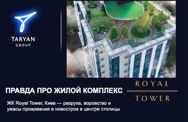 Дабы не быть голословными, владельцы квартир (они же - инвесторы) недавно проданного и заселенного жилого комплекса Royal Tower (ул. Саксаганского 37К) на протяжении уже 2-х лет засыпают жалобами и управляющую компанию, и Taryan Group, и даже пишут ее владельцу Артуру Мхитаряну про творящуюся разруху в доме, про то, как поставленная ими (Taryan Group и Мхитаряном) управляющая компания “Роял сервис” наживается на жильцах дома и шантажирует их, но в ответ - тишина.
