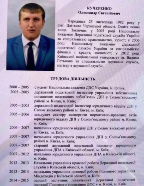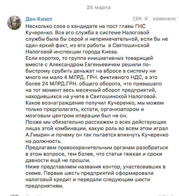 "Несколько слов о кандидате на пост главы ГНС Кучеренко. Вся его служба в системе Налоговой службе была бы серой и непримечательной, если бы не один яркий факт, из его работы в Святошинской Налоговой инспекции города Киева.