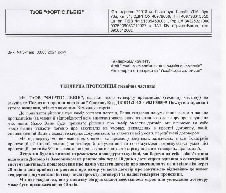 Филиал «Украинская железнодорожная скоростная компания» АО «Укрзализныця» подписала договор относительно предоставления услуг по стирке постельного белья с компанией «Фортис Львов», занимавшейся очисткой труб и вентиляционных каналов.
