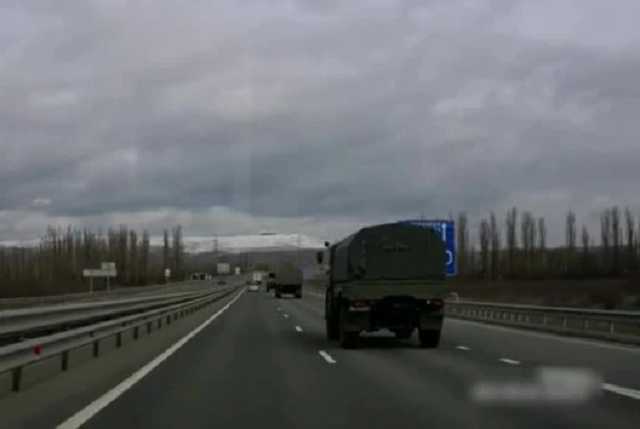 На них видно колону бронетехніки, яка їде у напрямку Керчі. Яку техніку стягує Росія Самохідні артилерійські установки, бронетранспортери, військові вантажівки. Вони приїхали на окупований півострів з Краснодарського краю.