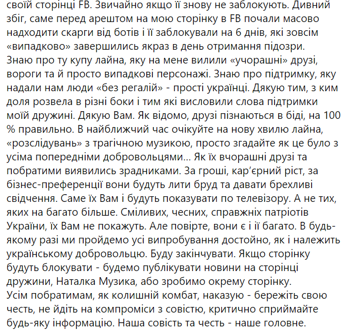 Об этом сообщила его жена Наталка Музыка в Facebook 3 апреля, написав пост на странице супруга.
