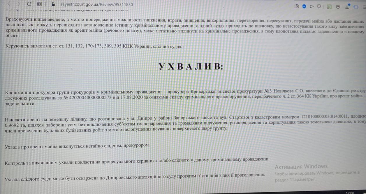 В этом решении много ошибок. Начиная с того, что участок – это частная собственность, а дело рассматривается по ч.2 ст. 364 УК (злоупотребление властью или служебным положением), и такая квалификация не может касаться частных лиц. Но кому какое дело, когда речь заходит о больших деньгах! Просто прокурор Станислав Новичков под надзором прокуратуры Днепропетровской области использовал свое служебное положение для корысти и заблокировал на месяц строительство автосалона.