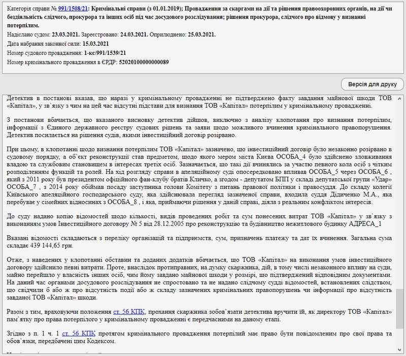 По данным реестра судебных решений, директор ООО “Капитал” подала заявление о совершении преступления в САП 3 февраля 2021 года. Она сообщила о “создании и активной деятельности организованной преступной группы под руководством мэра города, в состав которой входят высшие руководящие лица Киева, депутаты Киевсовета, должностные лица КГГА, Департамента коммунальной собственности города КГГА и другие”. По ее словам, целью их деятельности является незаконное завладение коммунальным имуществом для использования в собственных целях и с целью обогащения.