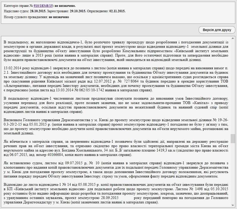 Нужно отметить, что за расторжение инвестиционного договора с ООО “Капитал” “окружение Кличко” начало бороться еще в 2015 году. Весной 2015 года ООО “Альтернатива” обратилось с иском в Хозяйственный суд Киева о признании этого соглашения недействительным и устранении препятствий в пользовании имуществом – зданием по ул. Б. Хмельницкого, 34, лит. Б, Б’. Ответчиками выступали Департамент коммунальной собственности КГГА, КП “Дирекция реставрационно-восстановительных работ” и ООО “Капитал” (дело №910/8884/15). Свои требования ООО “Альтернатива” объяснило тем, что реконструкция и строительство нежилого дома во исполнение инвестдоговора может нарушить права компании как арендатора, такие работы сделают помещения непригодными для нормальной эксплуатации и т.д.