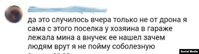 «Это случилось вчера, только не от дрона. Я сама с этого поселка. У хозяина в гараже лежала мина, а внучек ее нашел. Зачем людям врут? Я не пойму. Соболезную».
