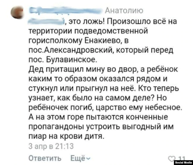«Произошло все на территории, подведомственной горисполкому Енакиево, в пос. Александровский, который перед пос. Булавинское. Дед притащил мину во двор, а ребенок каким-то образом оказался рядом и стукнул или прыгнул на нее. Кто теперь узнает, как было на самом деле?»