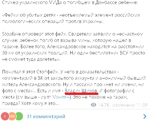 Трагическая гибель ребёнка в н.п. Александровское стала не просто очередным эпизодом в истории оккупированного Россией Донбасса, но более того – витком очередной пропагандистской истерии и полномасштабной ИПСО, по дискредитации ВСУ. Но, дело в том, что сами же участники этой дискредитации, не смогли её провести достаточно эффективно, буквально на каждом факте, спотыкаясь и выдавая свои ложь и манипуляции, своим же неумением и непрофессионализмом.