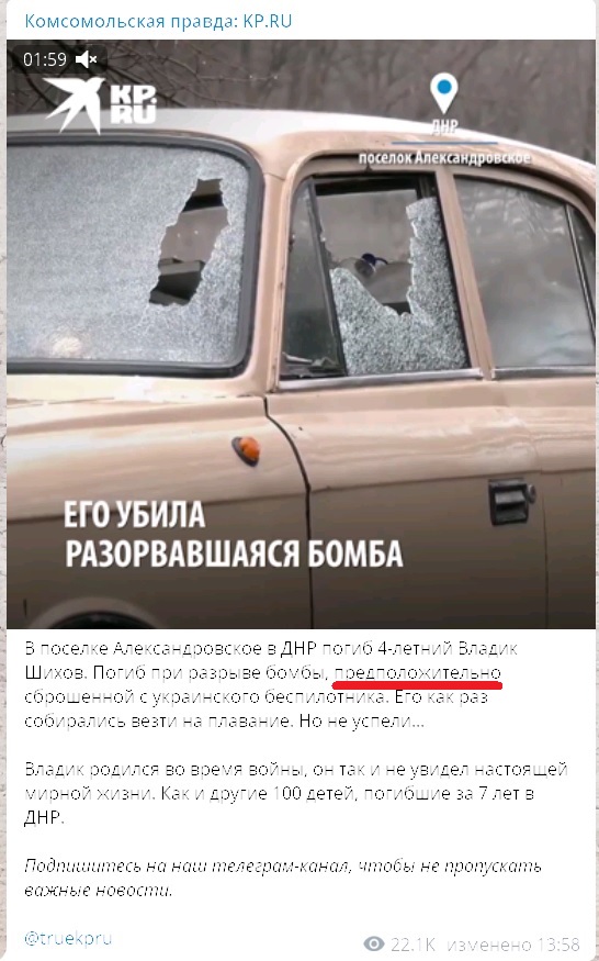 А сегодня, 7 апреля, в текстах российских пропагандистов появляется новая формулировка – ребёнок погиб “при разрыве бомбы, предположительно сброшенной с украинского беспилотника”. Предположительно? Вы же все эти дни расшибали лоб о стену, утверждая, что именно украинский дрон убил ребёнка, а теперь пишите, что предположительно? То есть, на самом верху, а именно в МО РФ, которое курирует издание “Комсомольская правда” увидели, что за ахинею несут их говорящие головы и дали команду включать заднюю, пока совсем не закопались в своём же гуано?