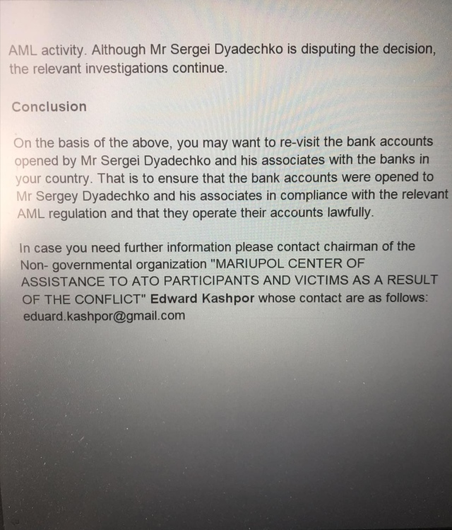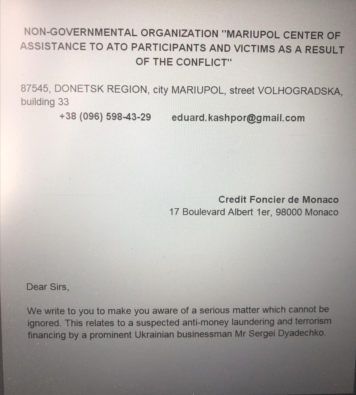 В распоряжении нашей редакции оказался один из таких запросов - в банк Credit Foncier de Monaco, отправленный председателем общественной организации «МАРИУПОЛЬСКИЙ ЦЕНТР ПОМОЩИ УЧАСТНИКАМ И ЖЕРТВАМ АТО В РЕЗУЛЬТАТЕ КОНФЛИКТА» Эдуардом Кашпору.