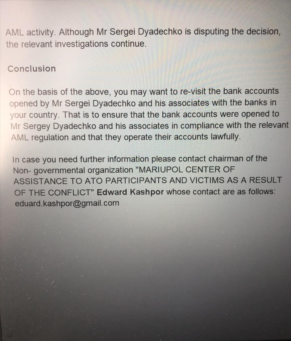 На основании вышеизложенного вы можете повторно проверить банковские счета, открытые Сергеем Дядечко и его сотрудниками в банках вашей страны. Это необходимо для обеспечения того, чтобы банковские счета были открыты г-ну Сергею Дядечко и его сотрудникам в соответствии с соответствующими положениями о AML activity и чтобы их счета на законных основаниях".