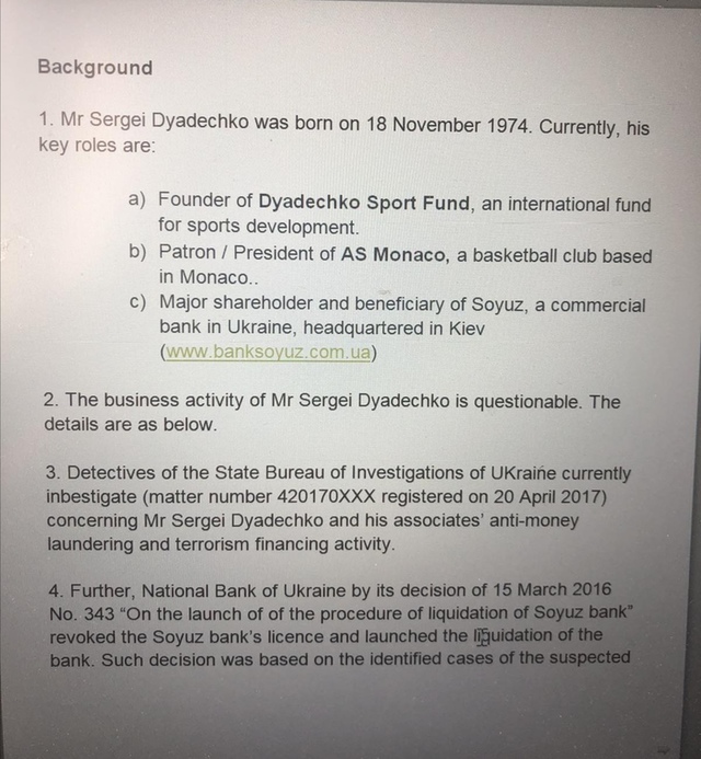 В запросе Эдуарда Кашпору, относительно средств на счетах Сергея Дядечко, членов его семьи и других связанных с ним лиц выражается озабоченность возможным незаконным происхождением этих средств, а также просьба проверить законность их происхождения в виду ряда уголовных расследований против Сергея Дядечко правоохранительными органами Украины: "Деловая активность Сергея Дядечко вызывает сомнения. Детективы Государственного бюро расследований Украины в настоящее время занимаются расследованием (дело номер 420170XXX, зарегистрированное 20 апреля 2017 года) в отношении деятельности Сергея Дядечко и его сообщников в рамках борьбы с отмыванием денег и финансированием терроризма. Национальный банк Украины своим решением от 15 марта 2016 г. № 343 «О начале процедуры ликвидации банка «Союз» отозвал лицензию у банка «Союз» и начал ликвидацию банка. Такое решение было принято на основании выявленных случаев предполагаемой деятельности по отмыванию средств, полученных незаконным путем (AML activity). Хотя Сергей Дядечко оспаривает решение, соответствующие расследования продолжаются.