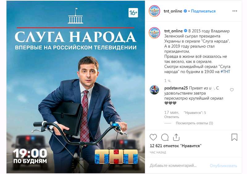Так, в декабре 2019 года скандал разгорелся вокруг другого сериала «95 квартала» — «Слуга народа», с Зеленским в главной роли. Права на него купил один из российских развлекательных телеканалов «ТНТ», но после показа первых трех серий его сняли с эфира. Причем из уже показанных серий вырезали отрывок, в котором шутили о Путине.
