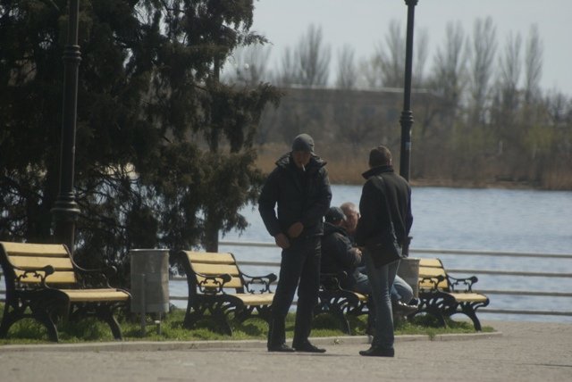 На набережной возле гостиницы «Фрегат» в окружении своих «коллег» сидит некто старший, кто раздает инструкции и деньги (на фото — в центре). Один из журналистов предположительно опознал в нем Владимира Паламарчука из Котовска Одесской области, с которым ранее сталкивался при подобных обстоятельствах.