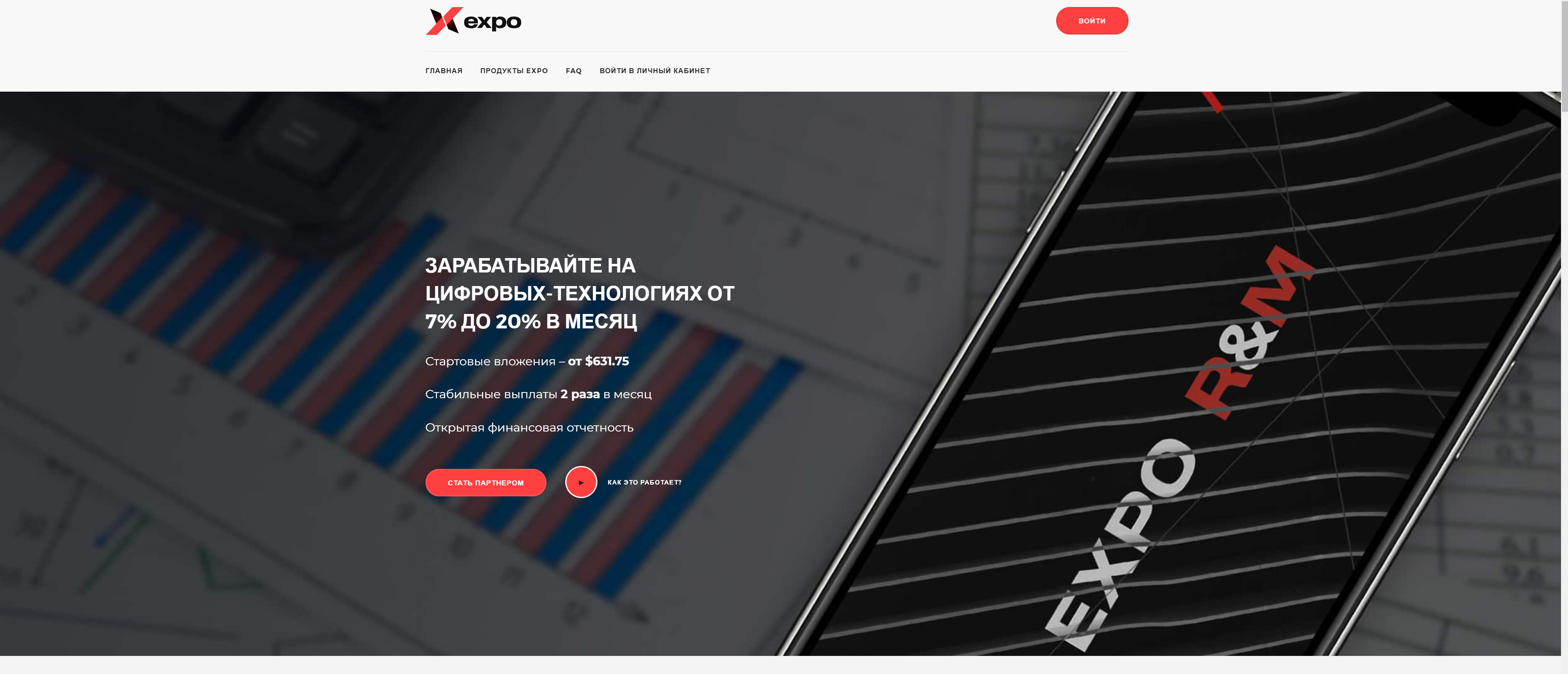 Идем на официальный сайт EXPO-holding. На главной странице – не продукт, который они собираются монетизировать, а предложение стать партнером, вложить деньги и заработать. Доходность обещают космическую – до 20% в месяц.