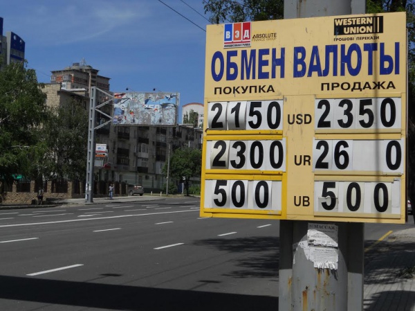 С этими рублями та еще история. Например, на рынке их чаще всего принимают, но в рублях, в отличие от гривны, не дают скидки. Почему? Курс рубля установлен приказом властей в 5 гривен за 10 рублей. При этом запрещено и зарабатывать на обмене. На всех обменных пунктах таблички имеют одинаковые цифры напротив рубля, как в окошке "покупка" так и "продажа".