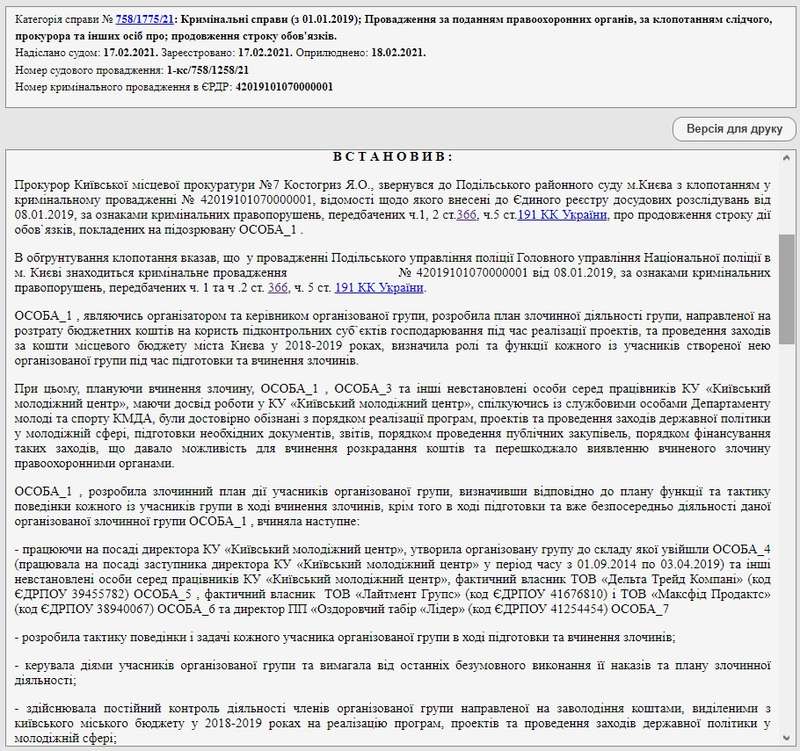 Как стало известно KV, 2 апреля 2021 года Подольский районный суд Киева на год (до 2 апреля 2022 года) продлил срок расследования уголовного производства №12021100070000256.