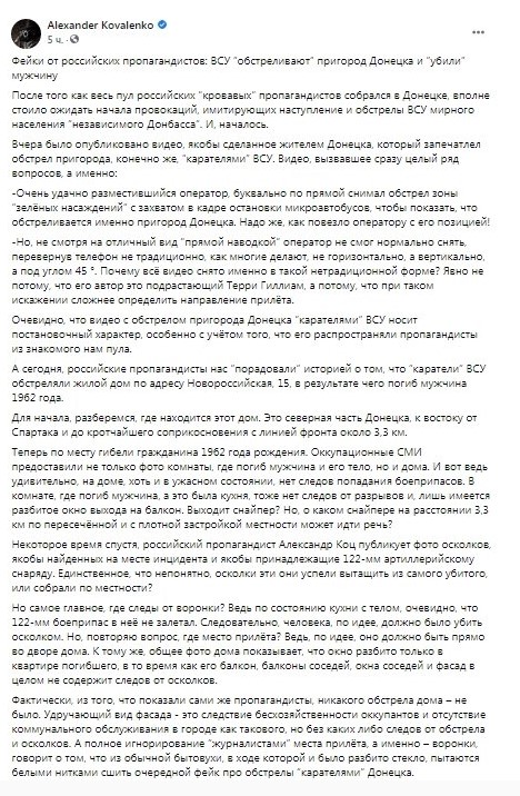 "Роспропаганда насыщает инфорпространство сообщениями о "гибели мирных жителей" якобы вследствие обстрелов украинской армии. Сейчас активно разгоняется сюжет с гибелью в Донецке мужчины (1962 или 1964 г.р., они пока не определились) якобы вследствие попадания осколка от украинского снаряда. Вчера под это дело разгоняли имитацию "обстрела", — рассказал он.
