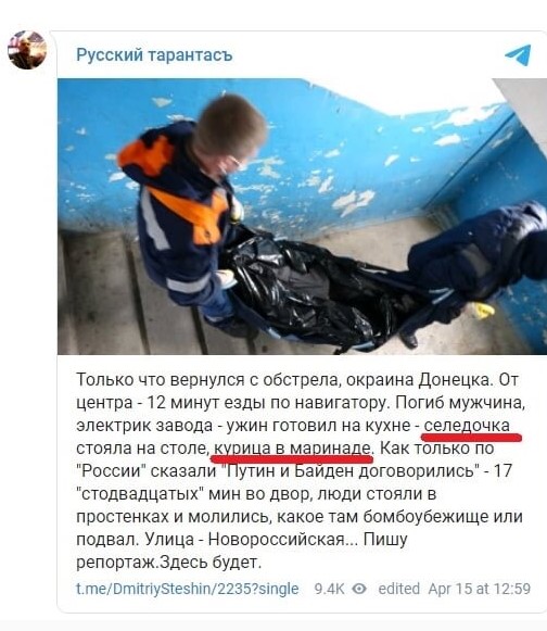 Блогер указал на неправдоподобность фейка пропагандистов. Он отметил, что вследствие "открытия огня" по жилому дому было повреждено только одно окно в квартире погибшего, а на фасаде здания, который находится примерно в 3,5 км от фронтовой линии, отсутствуют какие-либо признаки обстрела.