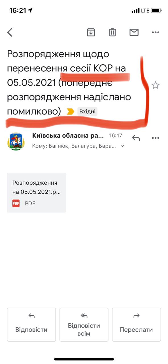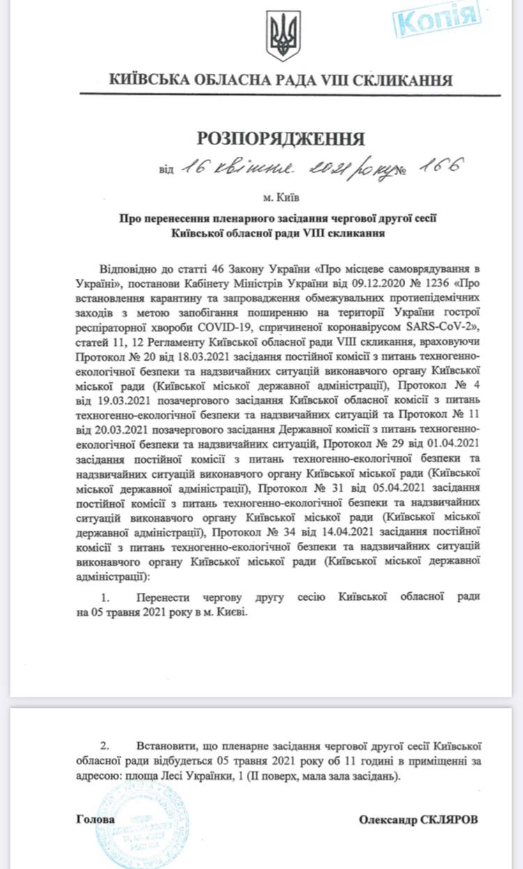 Как стало известно KV, вечером 16 апреля председатель Киевского областного совета (КОС) Александр Скляров распорядился об очередном переносе заседания облсовета – в этот раз на 5 мая 2021 года (сперва ошибочно разослав всем распоряжение с датой 4 мая).