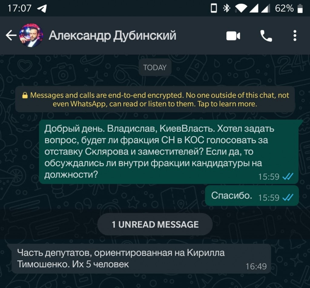 В переписке с журналистом KV Дубинский отметил, что за отставку Склярова готовы проголосовать 5 представителей фракции СН в КОС, ориентированных на замглавы Офиса Президента Кирилла Тимошенко.