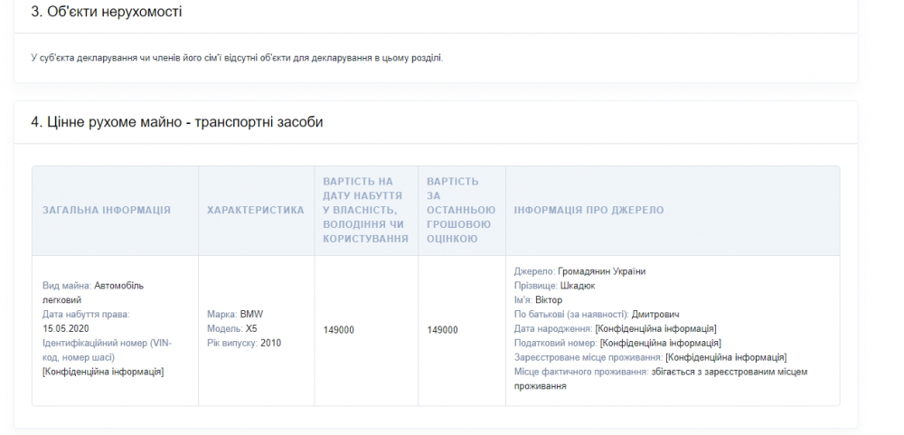 Автомобиль BMW X5 (2015) Оксана Маринчук приобрела в июле 2020 года. Согласно декларации ее стоимость составляет 49 тыс. гривен. При этом, на украинском рынке стоимость аналогичного автомобиля стартует с 787 тыс. гривен и доходит до 1,39 млн гривен. Интересно, что в прошлом году чиновник подавала декларацию о получении авто, где были абсолютно другие данные. Тогда она указала, что в мае (!) купила BMW X5 (2010) за 149 тыс. гривен.