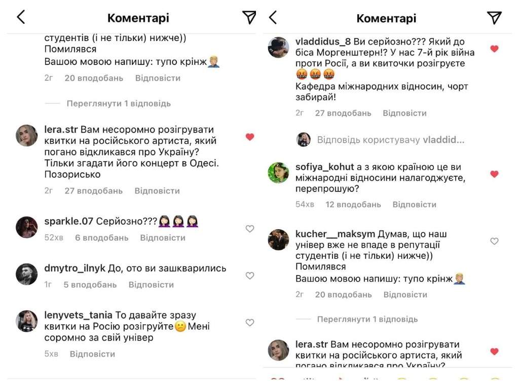 "Слушайте себе в наушниках хоть гимн СССР, это уже ваше личное дело. Но Национальному университету Украины не идет разыгрывать билеты на такой концерт и при этом не реагировать на возмущение людей. И это еще международники".