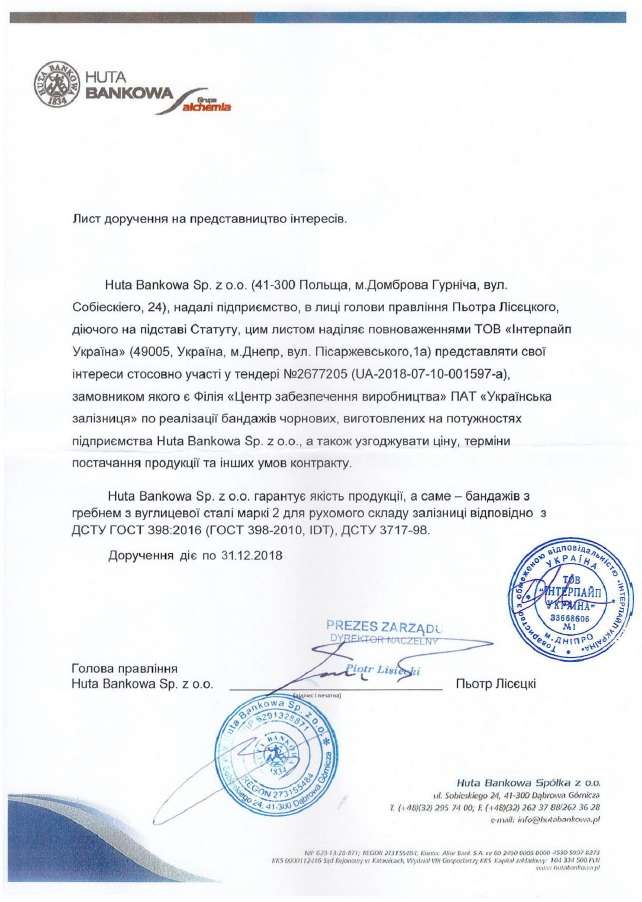 Несмотря на то, что поляки не выиграли ни одного тендера, «Интерпайп» приходилось держать цены по крайней мере в адекватном диапазоне к предложениям «Huta Bankowa». И похоже, что в какой-то момент компания Пинчука сделала польской фирме предложение, от которого та не смогла отказаться. В 2018 году «Huta Bankowa Spółka» перестала участвовать в торгах УЗ, зато у польской компании появился новый дилер - ООО «Интерпайп Украина» (см. фото). Конкуренты объединились.