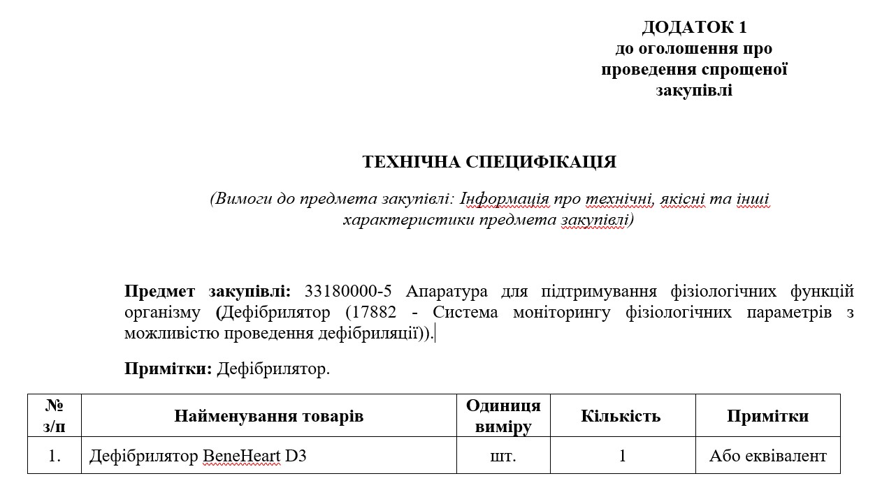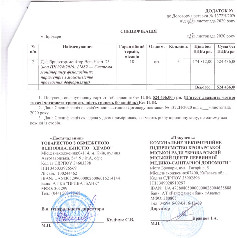 1. Коммунальное некоммерческие предприятия Броварского городского совета «Броварский городской центр первичной медико-санитарной помощи» (процедура закупки UA-2020-11-27-003434-c) приобрел в ноябре 2020 года у ООО «Здраво» три дефибриллятора Bene Heart D3 по цене 174.812,00 грн без НДС за штуку!!!