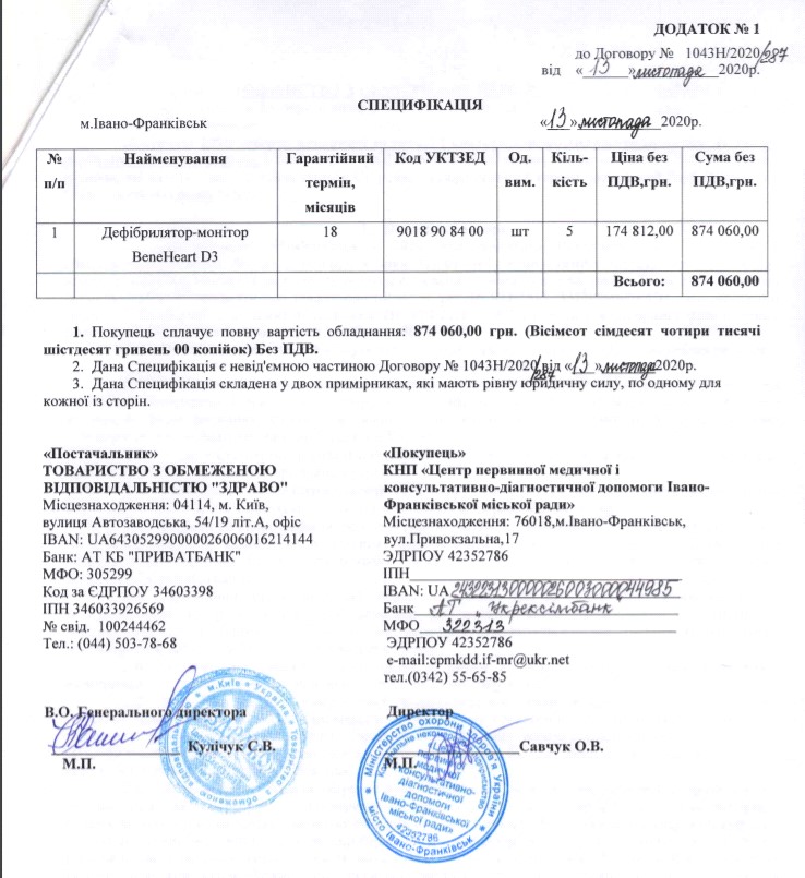 2. Коммунальное некоммерческие предприятия «Центр первичной медицинской и консультативно-диагностической помощи Ивано-Франковского городского совета» (процедура закупки UA-2020-11-13-001114-c) приобрел в ноябре 2020 года у того же ООО «Здраво» пять дефибрилляторов Bene Heart D3 по цене 174.812,00 грн без НДС за штуку!!!