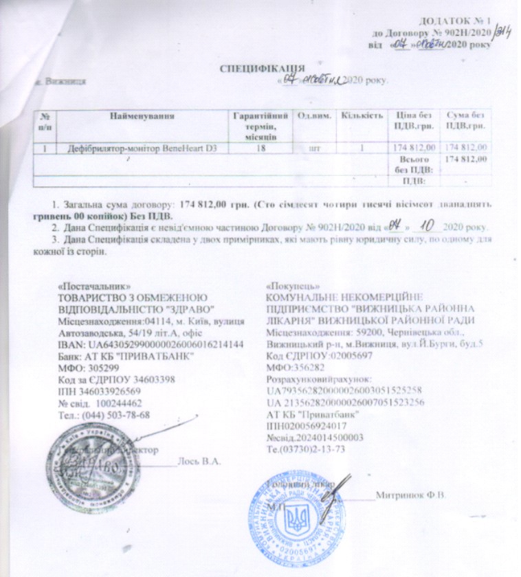 3. Коммунальное некоммерческое предприятие "Вижницкая районная больница" Вижницкого районного совета (процедура закупки UA-2020-10-07-001561-a) приобрел в октябре 2020 года у того же ООО «Здраво» один дефибриллятор Bene Heart D3 по цене 174.812,00 грн без НДС!!!