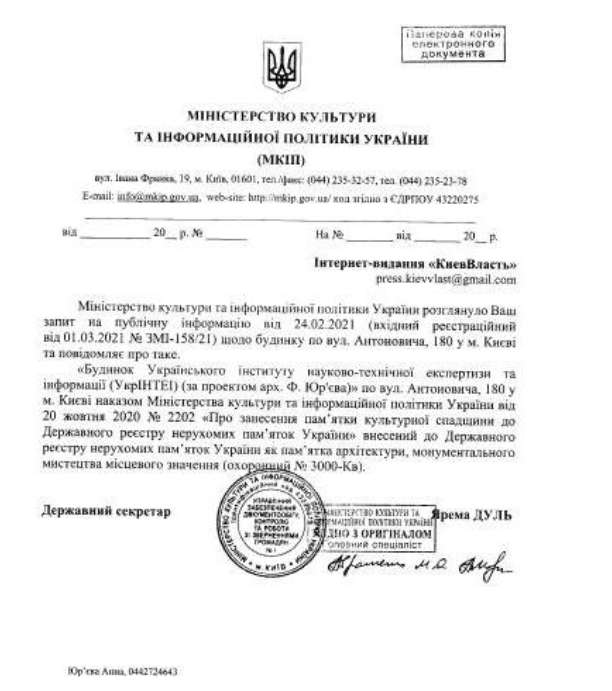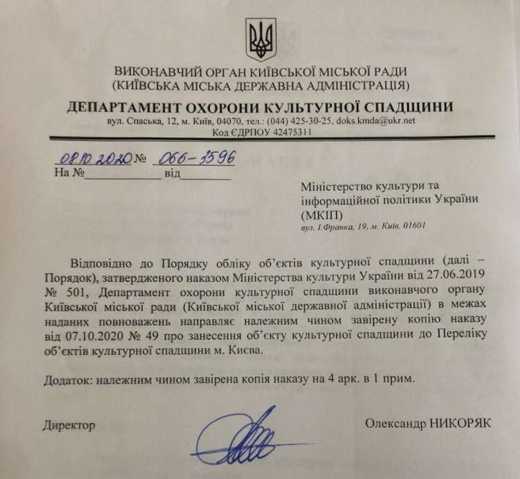 Про це KV стало відомо з відповіді Міністерства культури та інформаційної політики, Державного реєстру нерухомих пам’яток України і коментаря Департаменту охорони культурної спадщини КМДА.
