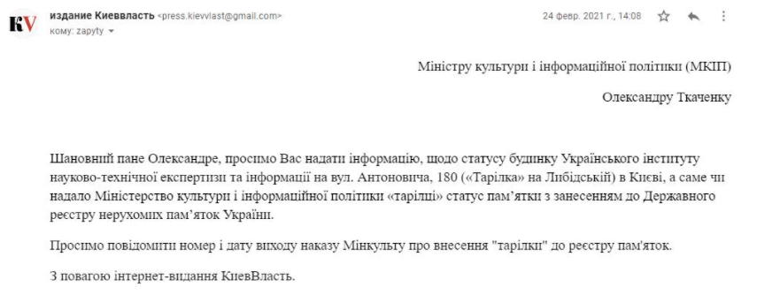 24 лютого КиївВласть направили в Мінкультури інформаційний запит.