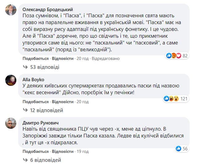 В комментариях многие пользователи не согласились с утверждениями писателя, несмотря на приведенные примеры. По мнению одного из них, Пасха имеет такое же право существовать в украинском языке, как и Паска, поскольку именно от этого слова образуется «пасхальний».